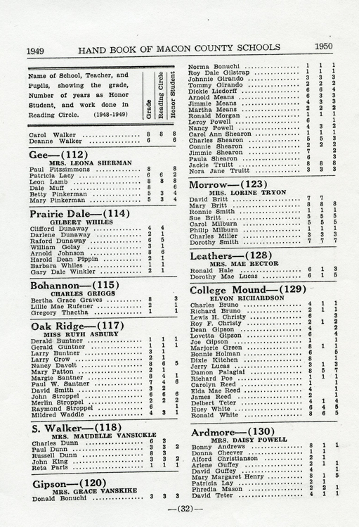 The teacher hired at the beginning of the year for Bohannon, was Miss Jean M. Maupin. She had taught at Brammer and Prairie Dale schools prior to that, and a student from a previous tenure suggests she lacked attention to her classes (sleeping on the job, etcetera). At the Bohannon School, Miss Maupin was the subject of gossip by the older students who suggested she was frequently impaired. She left at midterm and Charles Griggs, son of Charlie Griggs of the Anabel store, took over. He was planning to join the paratroopers, as I recall, but took this job in the interim. He was an excellent teacher of small children, which Miss Maupin was not. But to a first grader, her time at Bohannon was exciting. She drove an old, square looking car from the thirties. Her boy friend(s) sometimes came by. One drove a late-model Mercury, which seemed the epitome of class. We seemed always heading off someplace on a field trip in her old car. We played softball games against nearby schools. How all the students were transported is not now remembered, but I recall skittling out over those old rutted, dirt roads in that rattletrap car of hers. She showed up one day all banged and bruised, from a wreck we understood, and always there were the stories of her showing up at school, "Stiff as a board." I never quite knew what the fuss was about. I was a little sad to see her go, but Charles was the beginning of my formal education.
