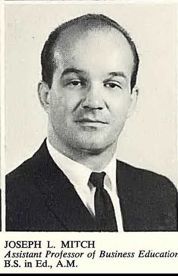 Note that Joe Mitch had just completed his freshman year at Northest Missouri State Teacher's College in Kirksville, Missouri. The first picture is from the 1951 college yearbook. Mr. Mitch completed his masters thesis at the school in 1959, and by 1965 was on the faculty (second picture from 1965, third from 1970). He passed away in 1976, and there is a memorial scholarship named for him.