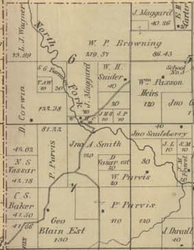 property, where the Union casualties were buried, and the road from the bridge over the North Fork of the Fabius River, down the length of Vassar Hill Road. The road today follows the left (westward) branch in the Jno A. Smith property toward the southwest corner of the map, and Bible Grove. The eastern branch going between the P. Purvis and Geo Blain properties does not exist today. The tiny dot northwest of the river crossing, at the sharp jog in the road, may have been the location of Pierce's Mill. |