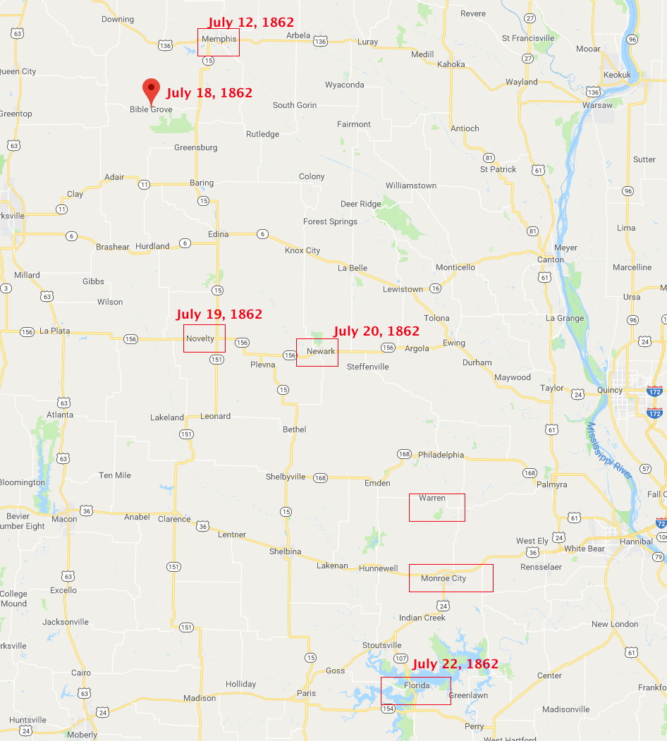 A comparison of plat maps to Mudd’s account reveals problems. Mudd says Porter’s men crossed the “Fabius Creek” bridge, rode about two or two and a half miles further , and established an ambush. From his description it is clear they were on the west side of the road. The Federal soldiers were fired on and retreated back down the road to “a dim road” that led them back to their command. Porter’s men repositioned half a mile northward, single file with about six to ten feet between them. A glance at the maps shows a problem with Mudd’s distance estimates. The village of Bible Grove was two and a half miles south of the Fabius bridge. If the ambush had occurred in Bible Grove, that fact would surely have been noted.