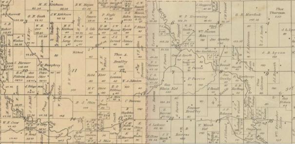 THBS’s great-great grandsons recently (June, 2015) visited the site of the battle. Plat maps of the area are available for the years 1858 (four years before the battle), and 1876 (fourteen years afterward). The 1858 maps show land ownership but not roads, streams and towns. These artifacts are available on the 1876 maps.