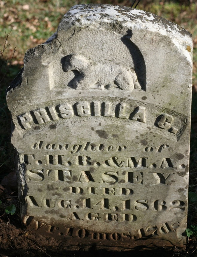 Thomas Hart Benton Stasey was killed at the Battle of Pierce's Mill, July 19, 1862. Priscilla Stasey, his daughter, died about August 24, 1862. The widow's parents, Orson and Margaret Sparks, lived at the location indicated above and are buried in the Sharpsburg Cemetery. It seems very reasonable to speculate that the daughter would have been buried beside her father, in Howe Cemetery. The child's marker could have served the family as a clandestine marker for her father, whose notoriety may have made an unmarked grave prudent.